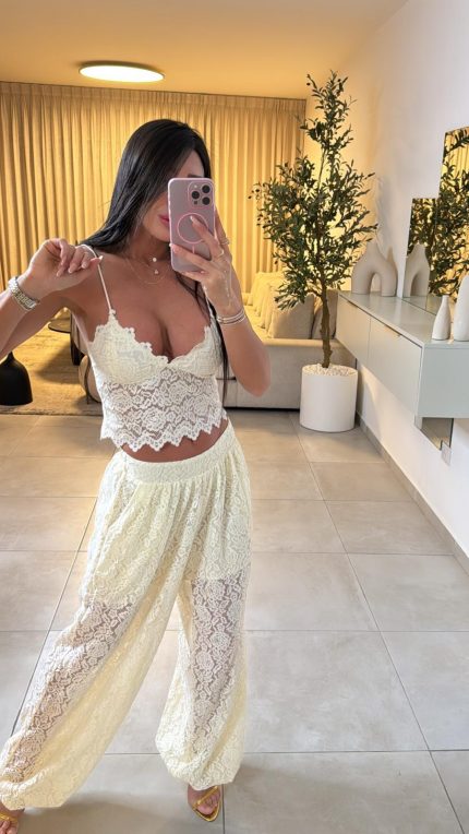 חליפת חצאית מכנס שילוב תחרה – לבן, l