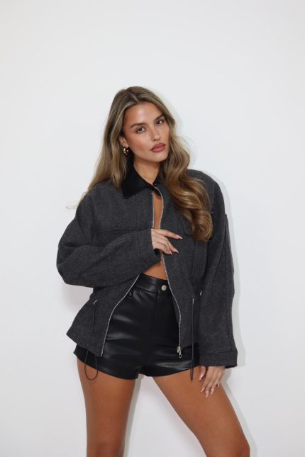 ג’קט צווארון דמוי עור – אפור-כהה, one-size