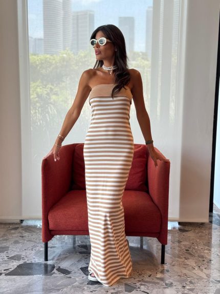 שמלת סטרפלס מקסי פסים – כאמל, one-size