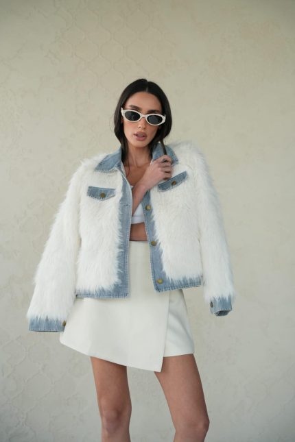 מעיל פרווה שילוב ג’ינס – לבן, one-size